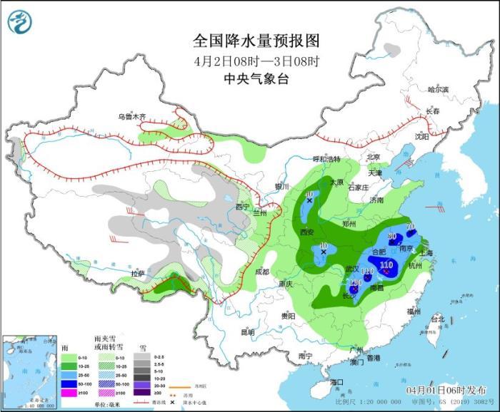 4月2日08時(shí)至3日08時(shí),青海中南部和東部、西藏東部和南部等地部分地區(qū)有小雪或雨夾雪。陜西大部、山西西部、河南中南部、安徽大部、江蘇大部、上海、重慶東北部、湖北大部、湖南中東部、江西西部和北部、浙江西北部等地部分地區(qū)有中到大雨,其中,安徽南部、江蘇中部、湖北東部、湖南東北部、江西北部等地部分地區(qū)有暴雨,局地大暴雨(100~130毫米)。吉林西部、西藏北部、青海西部等地部分地區(qū)有4~6級(jí)風(fēng)。