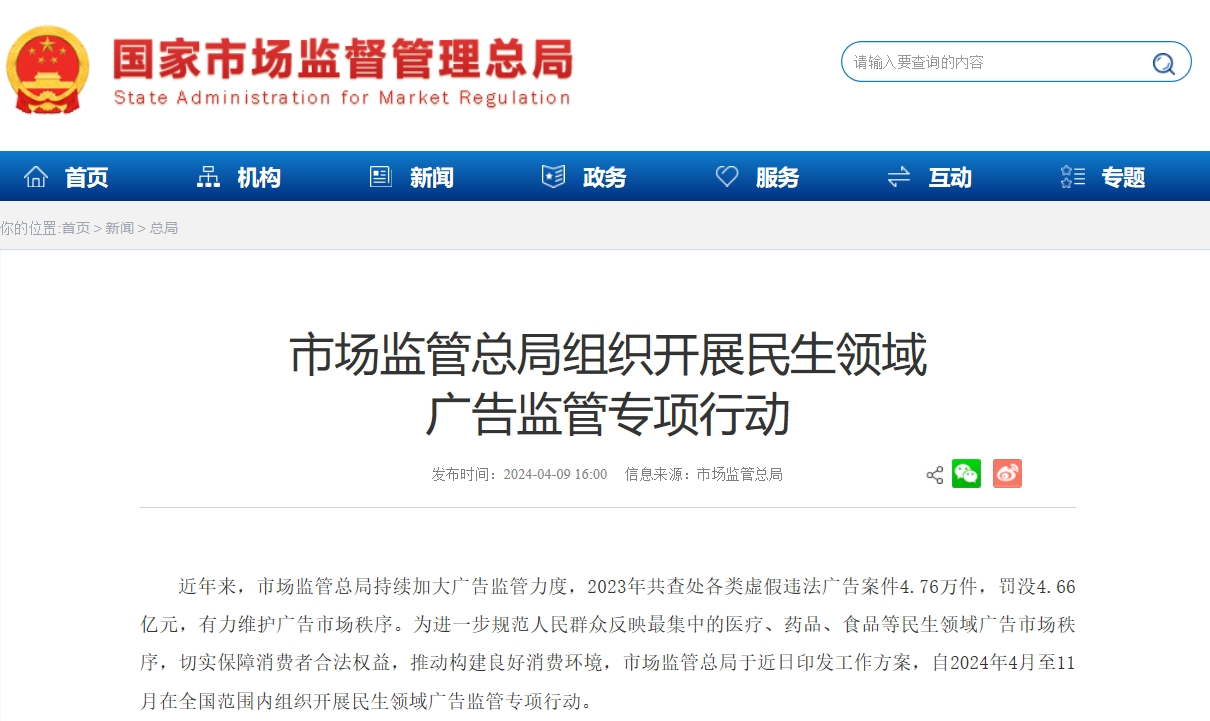央廣網(wǎng)北京4月9日消息(記者 果君)國家市場監(jiān)督管理總局于近日印發(fā)工作方案,自2024年4月至11月在全國范圍內(nèi)組織開展民生領(lǐng)域廣告監(jiān)管專項(xiàng)行動。