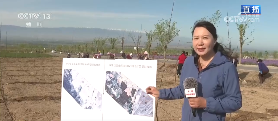 2016年8月拍攝的衛(wèi)星影像圖與2025年8月拍攝的影像圖對比后,明顯看出綠色增加了、綠地更多了,植被覆蓋率從23%提升到72%,區(qū)域降雨量增加了4到8毫米?,F(xiàn)在已經(jīng)種了2萬多畝糧油作物、1.8萬畝特色林果、2.2萬畝觀景花卉和世界上單體連片面積最大的薰衣草花田,以往寸草不生的荒蕪之地如今變成了生機(jī)盎然的天山花海。