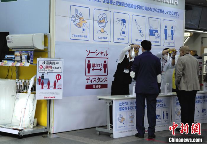 當(dāng)?shù)貢r(shí)間5月4日,日本東京某商店對(duì)進(jìn)店顧客進(jìn)行體溫檢測(cè)。