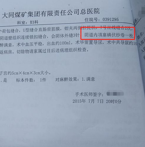 2015年7月,譚先生的母親曾在同煤集團總醫(yī)院婦科做手術(shù)。他提供的一份落款日期為2015年7月7日的手術(shù)記錄顯示,其母在大同市煤礦集團有限責(zé)任公司總醫(yī)院婦科做了“下行陰式子宮切除術(shù)+陰道前后壁修補術(shù)+尿道折疊術(shù)+盆腔粘連松解術(shù)”,縫合之后在“陰道內(nèi)填塞碘伏卷紗一枚”。