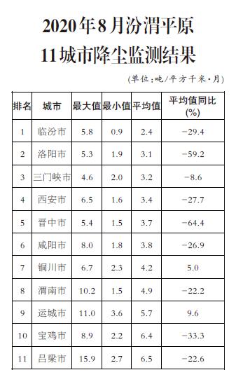 8月,汾渭平原11個(gè)城市降塵量均值范圍在2.4-6.5 噸/平方千米·月之間,平均為4.3噸/平方千米·月,同比下降30.6%。汾渭平原11個(gè)城市降塵量平均值均小于9.0噸/平方千米·月。渭南、運(yùn)城、呂梁等3個(gè)城市降塵量最大值大于9.0噸/平方千米·月;銅川、運(yùn)城等兩個(gè)城市降塵量平均值同比不降反升。
