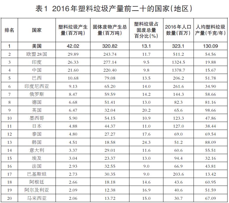 對(duì)比兩次研究結(jié)果發(fā)現(xiàn),從2010年到2016年,全球塑料生產(chǎn)量從3.34億噸增加到了4.22億噸,增加了26%,全球塑料垃圾占固體廢物的比例從10%上漲到了12%,2016年全球塑料垃圾達(dá)到了2.42億噸。從2016年每個(gè)國家產(chǎn)生的垃圾量(表1)看出,美國產(chǎn)生的固體廢物總量、塑料垃圾總量以及人均塑料垃圾產(chǎn)量(超過100千克)均為世界最多。相比之下,中國的人均塑料垃圾生產(chǎn)量?jī)H為美國的20%。歐盟28國作為一個(gè)整體,雖然總?cè)丝谥挥杏《然蛑袊丝诘?0%,產(chǎn)生的塑料垃圾總量比印度或中國都要多。但即便在歐盟,人均塑料垃圾產(chǎn)量也不到美國的一半。