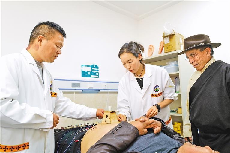 圖為在昌都市察雅縣藏醫(yī)院,重慶市大足區(qū)人民醫(yī)院援藏醫(yī)生(左)與藏醫(yī)院醫(yī)生結(jié)合中醫(yī)與藏醫(yī)療法,為患者進行診治。 記者 丹增群培 攝