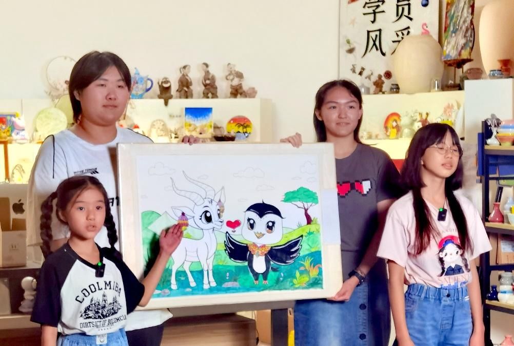活動(dòng)期間,北京的劉心語(yǔ)、吳梓菡、文藝、吳辰希與西藏的旦增雍措、旦增尼瑪、徐杰、索朗央珍等兩地青少年代表,通過“同繪一幅畫”的方式,將西藏的藏羚羊與北京的雨燕巧妙地融合在一個(gè)畫面之中。畫作中,一邊是象征北京自由與活力的“空中旅行家”雨燕在無(wú)邊的藍(lán)天中翱翔,另一邊則是代表西藏堅(jiān)韌與生機(jī)的藏羚羊在遼闊的無(wú)人區(qū)自由奔跑。盡管兩者習(xí)性迥異、棲息地不同,它們共同展現(xiàn)了自由無(wú)束的特質(zhì),寓意著京藏兩地青少年盡管生活在不同的文化環(huán)境中,卻都能追求自由和快樂的成長(zhǎng)。正如北京的孩子們說:“我們把來(lái)自拉薩的藏羚羊和來(lái)自北京的小雨燕聚集到一起,畫在了一個(gè)畫面中。看:藏羚羊戴著藏族耳飾,小雨燕身著云領(lǐng)服飾,她們是盛裝出席啊。就像我們,北京和西藏的同學(xué)們,手拉著手,心連著心,書信往來(lái),學(xué)習(xí)探究,相互幫助,一起成長(zhǎng)?!蔽鞑氐暮⒆诱f:“我們就像畫中的藏羚羊和北京雨燕一樣,心手相牽,互相鼓舞,用積極的態(tài)度學(xué)習(xí)、生活,成為祖國(guó)的好少年!”。