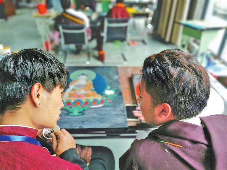 唐卡畫師在交流唐卡漆畫創(chuàng)作技巧。