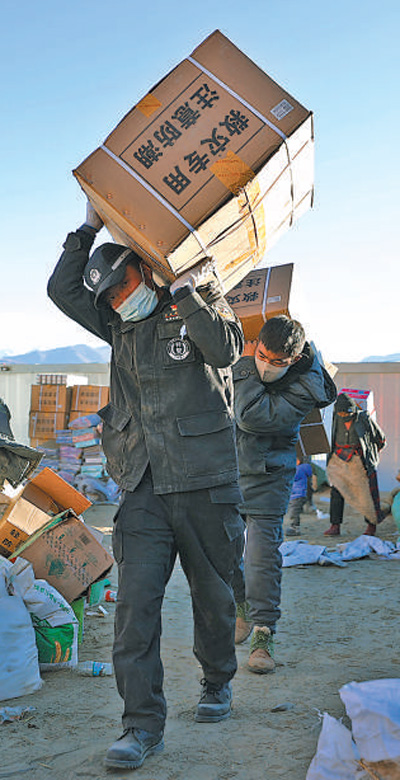1月10日,日喀則市特警在古榮村安置點同受災群眾一起搬運物資。人民日報記者 張武軍攝