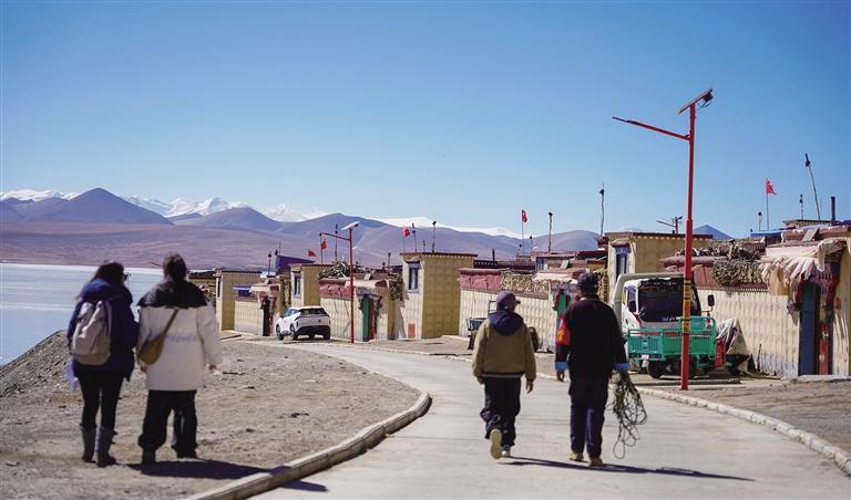 浪卡子縣打隆鎮(zhèn)推瓦村,南部與不丹接壤,邊界線長達25公里,是世界上海拔最高的純牧業(yè)行政村之一。全村共有40戶人家,153位村民在此生活。2月6日,記者踏入推瓦村,首先映入眼簾的是遠處的普姆擁措湖,湖面在陽光的照耀下波光粼粼,與錯落有致的雪山相互映襯,構成一幅絕美的畫面。沿著平坦的柏油馬路前行,道路兩旁整齊排列的路燈和一排排以溫馨黃色為主色調的邊境小康房格外引人注目。漫步在臨近冰湖的村路上,悠然愜意之感油然而生,雪山、湖泊、村落與村民們和諧相融,共同繪就了一幅寧靜祥和的鄉(xiāng)村畫卷。