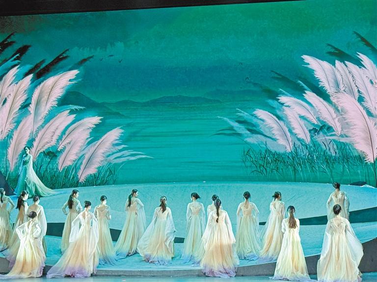 劇中的舞段既有取材于《詩經(jīng)》的女子群舞《蒹葭蒼蒼》,也有凸顯格薩爾王英雄氣概的《格薩爾王》和《英雄足跡》,以及引導(dǎo)人們積極向上的《鳳凰于飛》。觀眾可以近距離地領(lǐng)略展現(xiàn)漢藏農(nóng)耕文化、體現(xiàn)天人合一宇宙觀的《其耕澤澤》,以及體現(xiàn)民族融合的《悠悠我心》《茶城歡歌》《鼓舞中華》等作品。