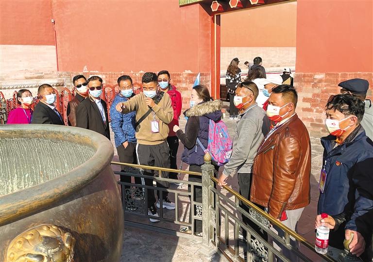 學(xué)員們?cè)诒本┟褡逦幕瘜m參觀并合影留念。