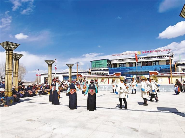 圖為上海援藏打造的鄉(xiāng)村振興示范點(diǎn)——江孜縣索蓋村,群眾載歌載舞慶祝新生活。