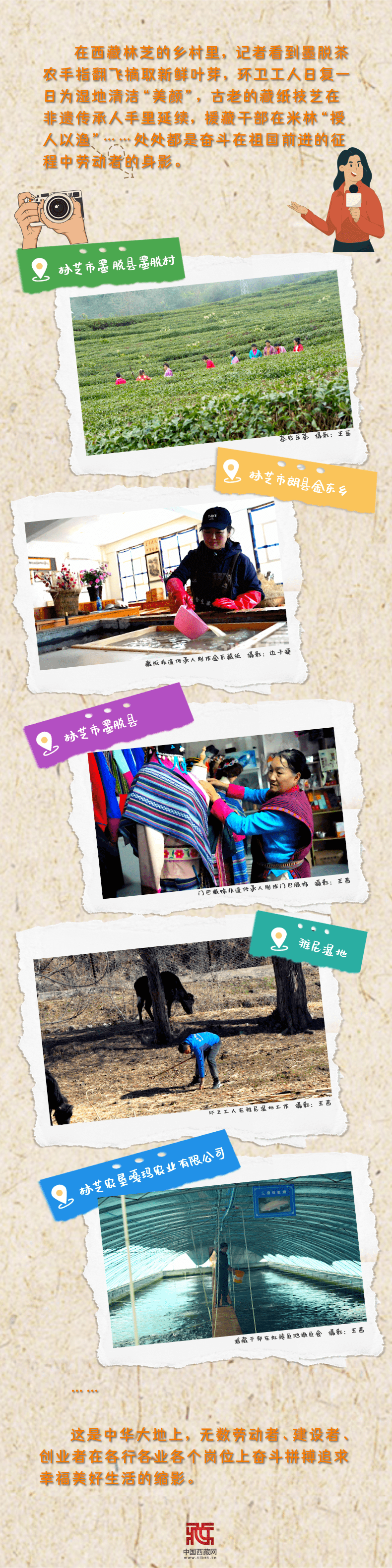 在西藏林芝的鄉(xiāng)村里,記者看到墨脫茶農(nóng)手指翻飛摘取新鮮葉芽,環(huán)衛(wèi)工人日復(fù)一日為濕地清潔“美顏”,古老的藏紙技藝在非遺傳承人手里延續(xù),援藏干部在米林“授人以漁”……處處都是奮斗在祖國前進(jìn)征程中勞動者的身影。這是中華大地上,無數(shù)勞動者、建設(shè)者、創(chuàng)業(yè)者在各行各業(yè)各個崗位上奮斗拼搏追求幸福美好生活的縮影。