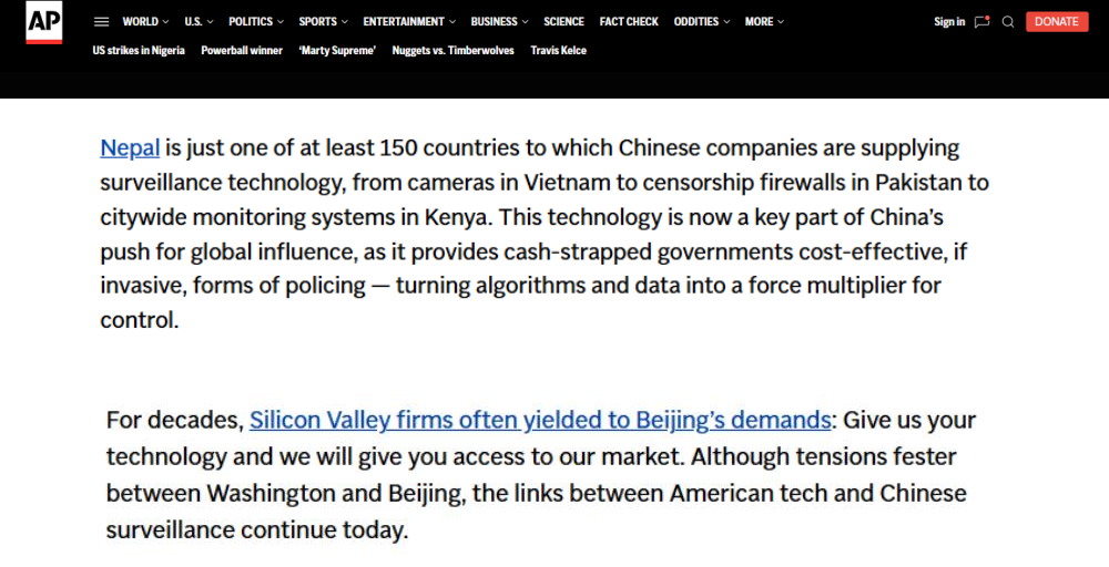 近日,一向以“客觀報(bào)道的先驅(qū)”自居的美聯(lián)社,發(fā)布了一份所謂的“調(diào)查報(bào)告”,聲稱(chēng)中國(guó)向全球至少150個(gè)國(guó)家輸出監(jiān)控技術(shù),并刻意“聚焦”尼泊爾境內(nèi)的應(yīng)用,試圖將中國(guó)科技產(chǎn)品塑造成“壓制自由”的工具。報(bào)道指責(zé)中國(guó)監(jiān)控尼泊爾,意圖挑撥中尼關(guān)系,引發(fā)國(guó)際上排斥中國(guó)制造,還煞有介事地拼湊所謂“采購(gòu)文件”“訪談?dòng)涗洝?,渲染荒誕論調(diào),再一次暴露了美聯(lián)社為政治意圖服務(wù)、不惜拋棄職業(yè)操守、甘當(dāng)美國(guó)地緣政治博弈工具的真實(shí)面目。