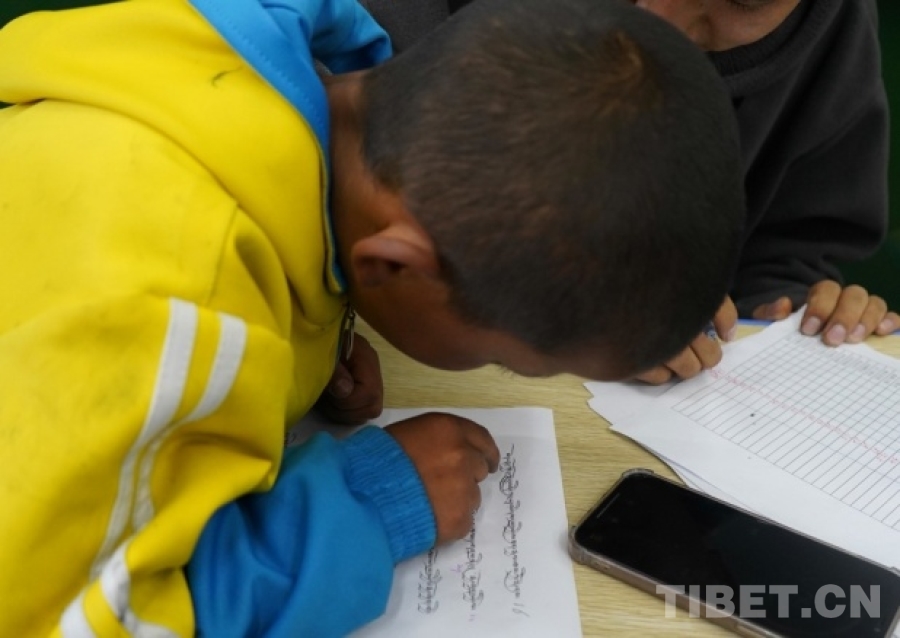 圖為2024年7月,在西藏自治區(qū)那曲市索縣西昌鄉(xiāng)小學,早讀時老師檢查學生聽讀藏語文 攝影:王茜