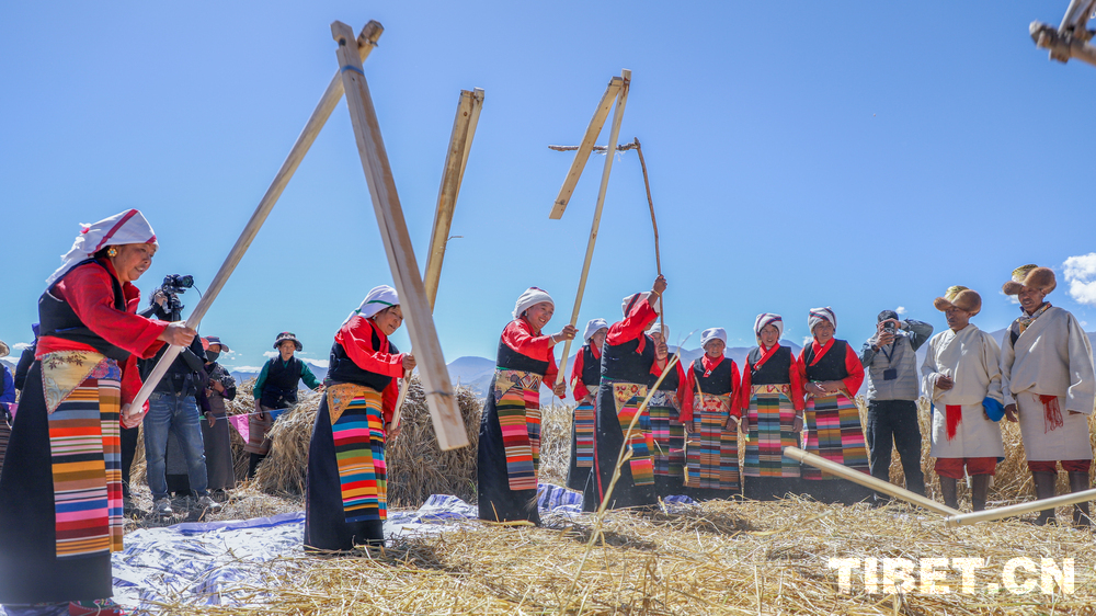 資料圖:西藏拉薩林周縣強(qiáng)嘎鎮(zhèn)典沖村村民展示傳統(tǒng)青稞脫粒 攝影:賈華加