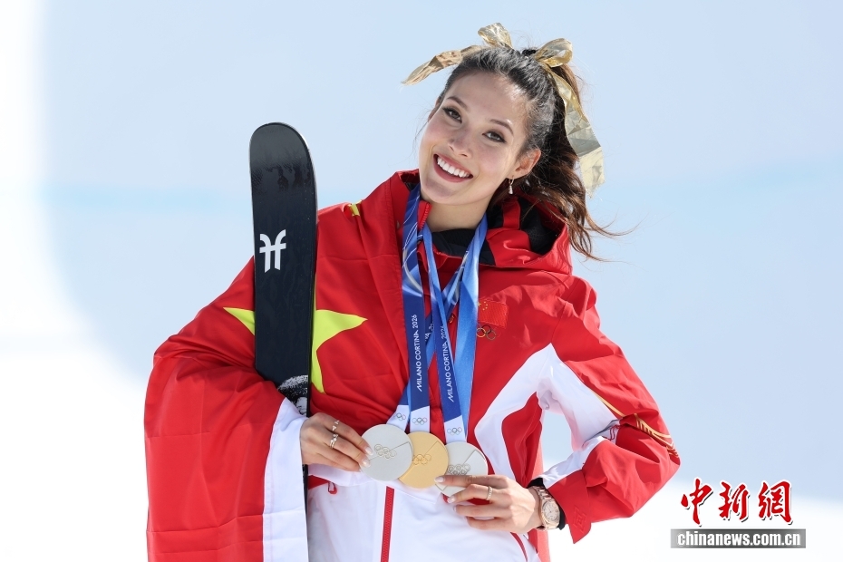 當(dāng)?shù)貢r(shí)間2月22日,中國(guó)選手谷愛(ài)凌展示其本屆冬奧會(huì)獲得的三枚獎(jiǎng)牌。