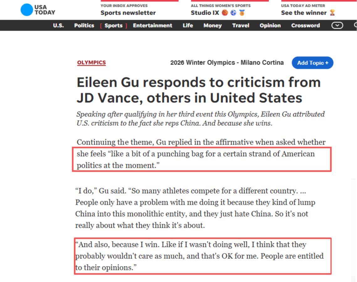 2026年2月19日,谷愛(ài)凌在接受《今日美國(guó)》時(shí)坦言自己像是某種美國(guó)政治勢(shì)力下的“靶子”。
