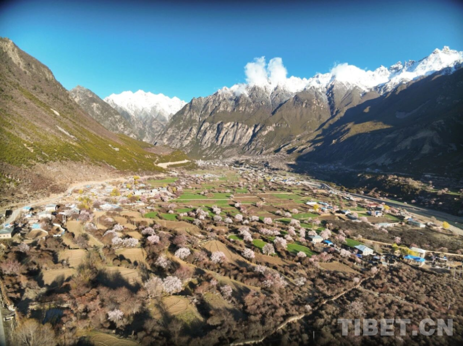 航拍視角下的尼屋春日,野桃林如粉霞般點(diǎn)綴在河谷村落,勾勒出“藏北江南”詩(shī)意畫卷 來(lái)源:那曲市文化和旅游局