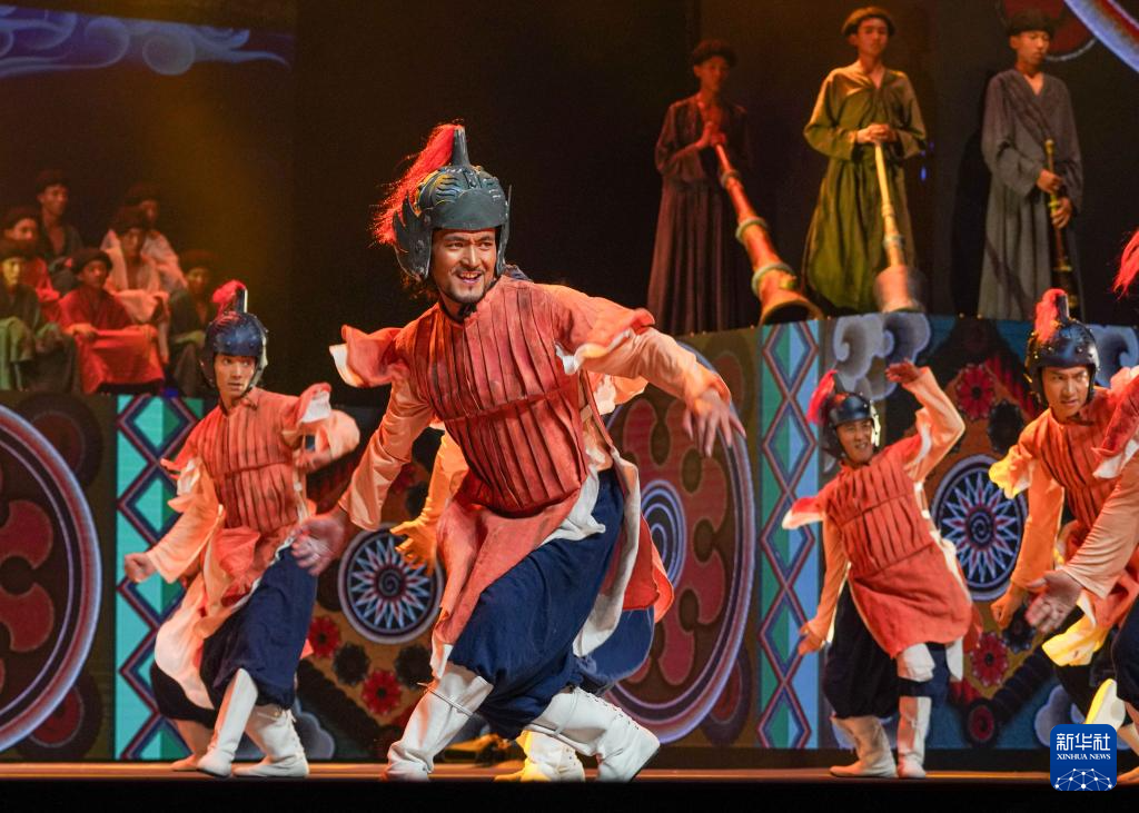 7月19日,在西藏拉薩《緣起象雄·古格遺風》情景歌舞詩演出現(xiàn)場,演員在表演節(jié)目《鼓樂喧天》。新華社發(fā)(格桑雍珍 攝)