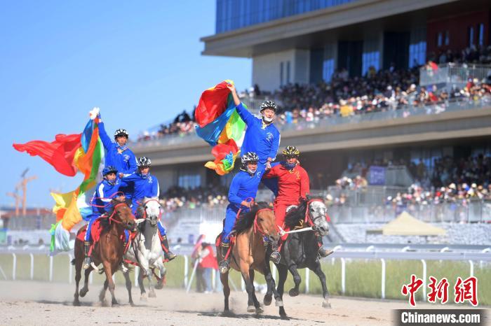 8月13日,中國(guó)·九色甘南香巴拉·瑪曲第十五屆格薩爾賽馬會(huì)在甘肅甘南藏族自治州瑪曲縣格薩爾賽馬中心開幕。圖為開幕式現(xiàn)場(chǎng)馬術(shù)表演。九美旦增 攝