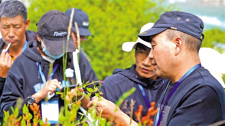 圖為藏醫(yī)專家(右一)現(xiàn)場(chǎng)講解野生藥材辨認(rèn)方法。