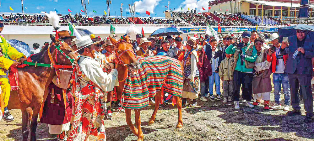 那曲格薩爾賽馬場內(nèi),來自西藏自治區(qū)內(nèi)外的馬主和騎手一邊相互介紹自己的駿馬,一邊等待比賽檢錄。魏冠宇攝
