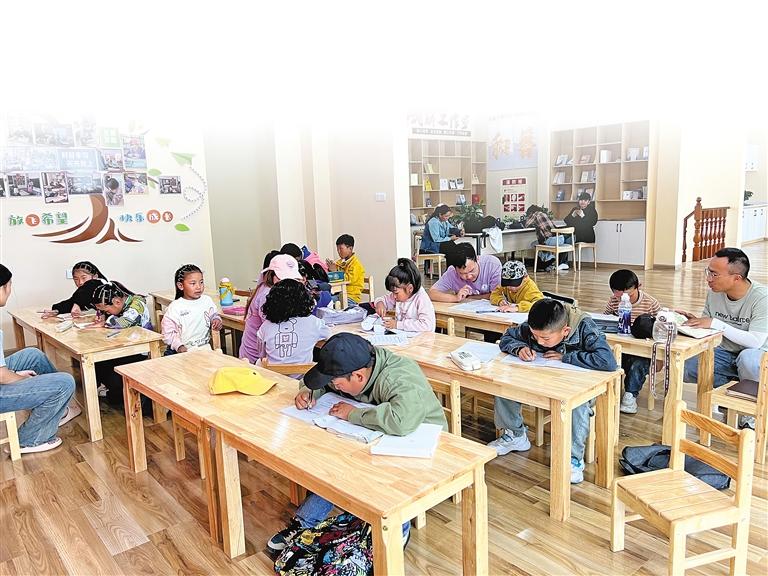 江蘇師范大學(xué)科文學(xué)院志愿者給社區(qū)孩子舉辦公益輔導(dǎo)班。圖/文 記者 巴桑旺姆