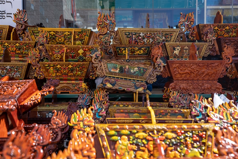 “老板,這個(gè)切瑪盒多少錢?便宜點(diǎn)我就拿走了?!薄斑@個(gè)圖案樣式都是精心雕刻的,最低1300元,實(shí)在不能再少了?!贝稳实牡赇伹?,不少顧客正在挑選“切瑪盒”,生意很是火爆。“切瑪盒”是將精制斗形木盒用隔板分開,左右兩邊分別盛入炒青稞和糌粑,再插上象征五谷豐登的“羅薩梅朵”和寓意吉祥的酥油花,寓意人壽年豐、吉祥如意,是藏歷新年家家戶戶必備的年貨之一。次仁告訴記者,“切瑪盒”根據(jù)圖案、顏料、大小、木材等因素,售價(jià)從幾百元到上千元不等,很多顧客普遍喜愛傳統(tǒng)樣式與圖案。