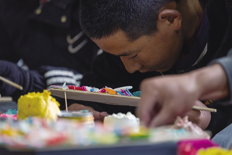 次仁羅布跟隨師傅已經(jīng)制作了30余年的酥油花。他告訴記者,在他的家鄉(xiāng)仁布縣,酥油花制作技藝是男女老少?gòu)男【驼莆盏募寄埽鄠?。次仁羅布的大兒子今年上大一,自幼跟父親學(xué)習(xí)捏酥油花,手藝嫻熟,早些年開(kāi)始他就已經(jīng)可以和父親一樣獨(dú)立完成一對(duì)酥油花的制作。