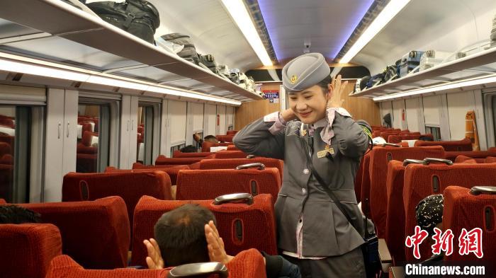 圖為譚珍帶著旅客做耳鳴操,緩解旅客在經過隧道時的耳鳴癥狀。貢桑拉姆 攝