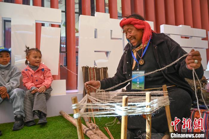 圖為工作人員展示牦牛毛編制技藝。貢確 攝