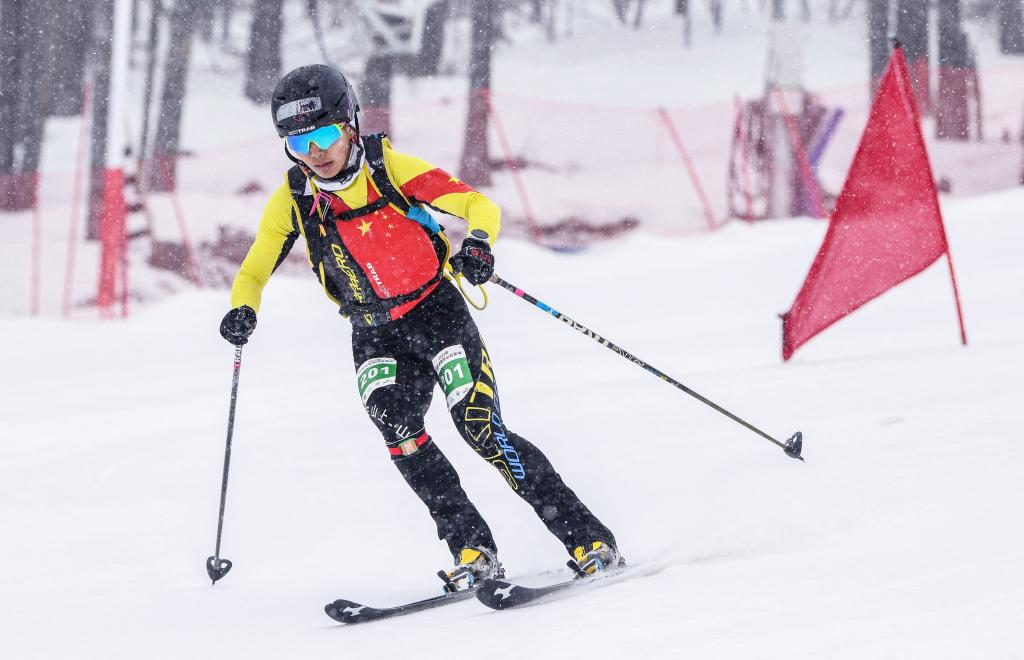 中國滑雪登山運動員玉珍拉姆在新疆富蘊縣可可托海國際滑雪度假區(qū)進(jìn)行的全國首屆滑雪登山冠軍賽短距離(女子組)比賽中。(2023年4月8日攝)。新華社記者 胡虎虎 攝