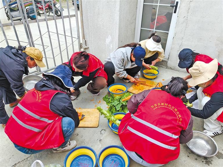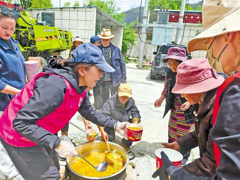 夏日的雅魯藏布江中游,碧水如緞,潺潺流水輕吻著岸邊碎石。位于江畔的山南市加查縣拉綏鄉(xiāng)棍追巴村委會小院里,鐵鍋支在土灶上“咕嘟咕嘟”地冒著熱氣,乳白的牛肉湯翻滾著,大塊的牛腩在湯中浮沉,胡蘿卜絲、土豆塊吸飽了湯汁,脹鼓鼓地透著香甜。