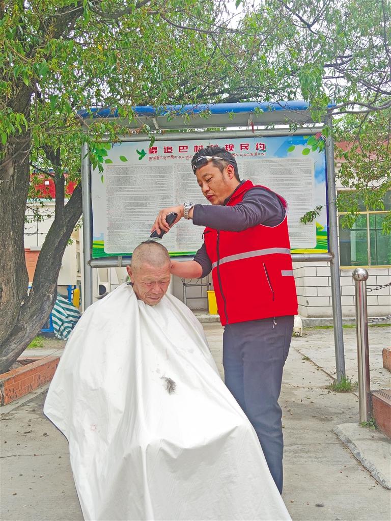 “次仁啦,夏天來了,天氣開始熱了,我把你的頭發(fā)修短點(diǎn)好不好?”在電推子的嗡嗡聲停止后,75歲的次仁邊照著鏡子邊摸著自己的頭說:“十分感謝,感覺我年輕了二十歲喲!”理完發(fā)的小朋友巴桑,蹦跳著跑到小伙伴跟前:“快看我的新發(fā)型,像不像解放軍叔叔?”