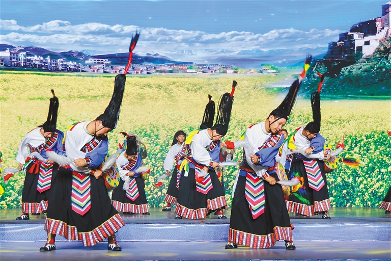 說(shuō)唱《聲生不息》以鏗鏘有力的節(jié)奏,再現(xiàn)世界最長(zhǎng)史詩(shī)《格薩爾王傳》中降魔濟(jì)世的英雄傳奇;舞蹈《達(dá)姆韻》以工布響箭舞步、熱瑪琴伴奏,將對(duì)生活的熱愛、對(duì)自然的敬畏,化作熱烈奔放的舞步,演繹著傳承千年的文化記憶,彰顯著工布獨(dú)特的生命張力與文化自信;《扎西央恰》將千年宣舞與噶爾舞創(chuàng)新融合,以莊重舒緩的舞步訴說(shuō)著高原先民對(duì)天地的敬畏,以雄渾激昂的鼓點(diǎn)展示雪域歷史的風(fēng)云激蕩,在莊重與激昂中訴說(shuō)阿里高原的歷史變遷……