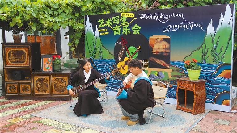 在音樂鑒賞環(huán)節(jié),拓崗扎念樂隊(duì)將傳統(tǒng)扎念琴演奏與現(xiàn)代音樂結(jié)合,表演了《卓木仁青崗》等曲目;青年歌手次仁羅布演唱藏族民歌,展現(xiàn)非遺特色。在藝術(shù)對談中,青年畫家雍忠卓瑪分享了自己克服身體障礙堅(jiān)持創(chuàng)作的經(jīng)歷,圍繞“自然與藝術(shù)的關(guān)系”展開討論,結(jié)合作品從藏族文化和鄉(xiāng)土景觀中獲取創(chuàng)作靈感的過程。在寫生體驗(yàn)環(huán)節(jié),活動參與者以德慶鎮(zhèn)民居和周邊自然景色為素材進(jìn)行創(chuàng)作,雍忠卓瑪從構(gòu)圖、色彩運(yùn)用等方面給予指導(dǎo),幫助活動參與者完成10余幅繪畫作品。