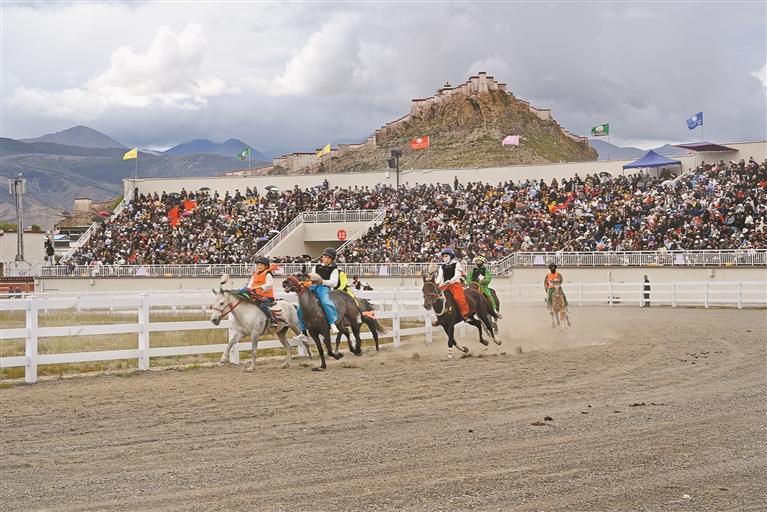 開幕式上,100位騎手策馬奔騰,繞場致意。隨后,擊鼓迎賓、紅色鼓陣、車仁望果、千年名城、英雄江孜、青稞之鄉(xiāng)等10個(gè)方隊(duì)和來自各鄉(xiāng)鎮(zhèn)的賽馬隊(duì)依次入場,全方位、多角度展示了江孜縣特色產(chǎn)業(yè)興旺、基礎(chǔ)設(shè)施提升、民生持續(xù)改善的美好圖景,展現(xiàn)了新時(shí)代英雄城兒女堅(jiān)韌不拔、昂揚(yáng)向上的精神風(fēng)貌,深情表達(dá)了江孜人民對黨的無限感恩、對祖國的無限熱愛、對西藏繁榮發(fā)展的美好祝愿。