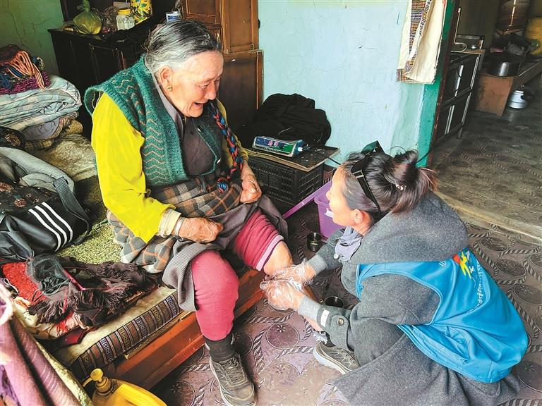 清晨的陽光灑在林周縣春堆鄉(xiāng)卡東村的土路上,林周縣民政服務(wù)站工作人員旦增旺姆背著裝滿蔬菜和藥品的布袋,熟門熟路地走進仁增拉卓老人的院子?!鞍尷?,今天給您帶了新鮮的蘿卜,再把降壓藥給您續(xù)上。”83歲的仁增拉卓顫巍巍迎上來,拉著旦增旺姆的手笑得眼角堆起皺紋——這樣的清晨探望,早已成為老人日常生活里的“定心丸”。