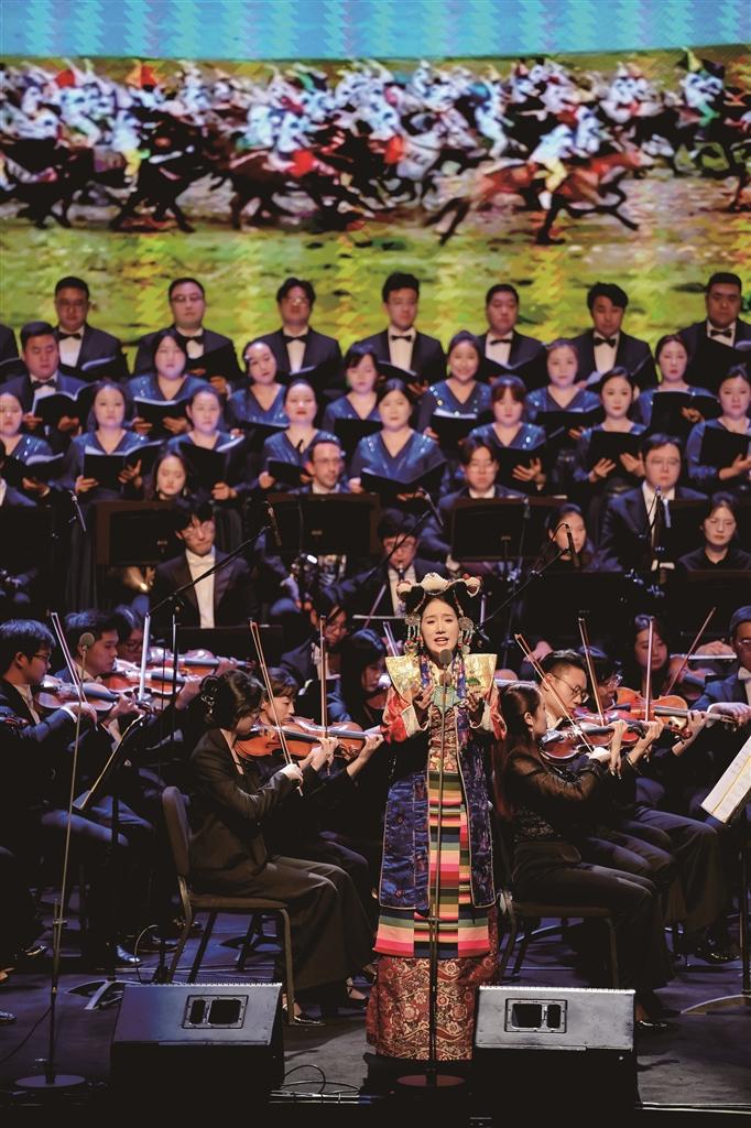 藝術(shù)形式的創(chuàng)新融合是本次音樂會的一大亮點。二重唱《茉莉與格?!穬?yōu)美詮釋了民族文化的交流共生;器樂演奏《“飛弦踏春”與“賽馬”》則讓著名二胡演奏家陳軍的激昂琴聲與扎念琴演奏員措姆的熱情彈奏展開對話,碰撞出令人振奮的藝術(shù)火花。從展現(xiàn)拉薩當代生活的電視劇插曲《藍天上的云》,到描繪鄉(xiāng)村振興新貌的《童話里的格林村》,再到融合原生態(tài)山歌與專業(yè)唱法、曾為中央代表團獻唱的《珠穆朗瑪》,一系列新創(chuàng)作品生動展現(xiàn)了傳統(tǒng)與現(xiàn)代交織、充滿活力的社會主義新西藏。