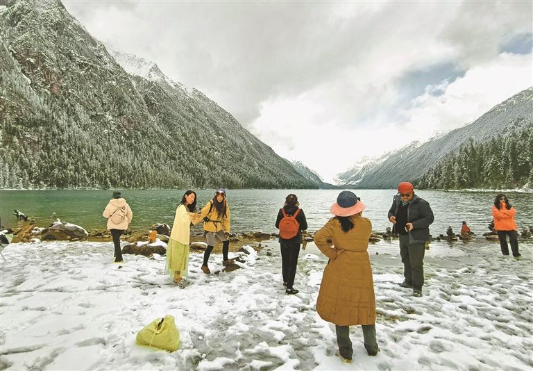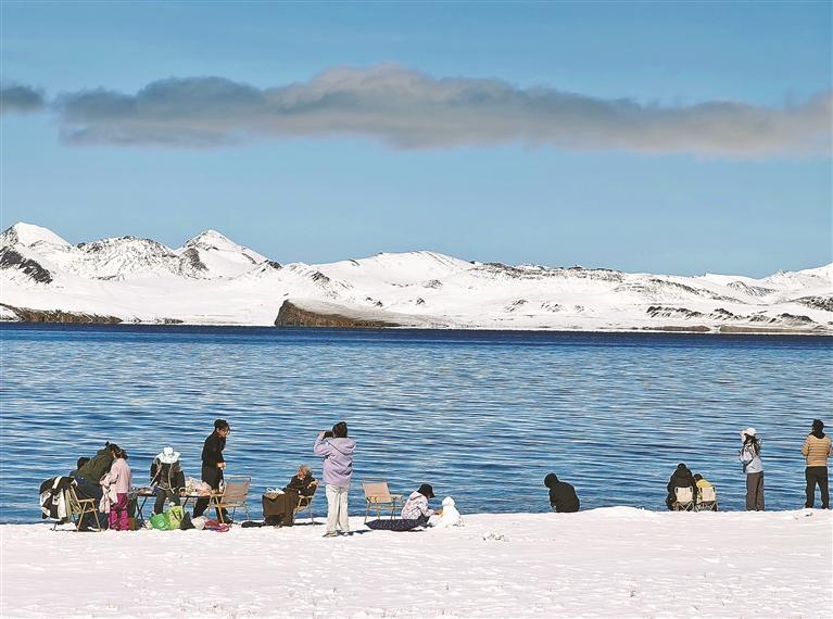 林芝市工布江達縣新錯湖畔,游客在雪景中打卡留念,盡享高原湖光山色。記者 次仁平措 攝