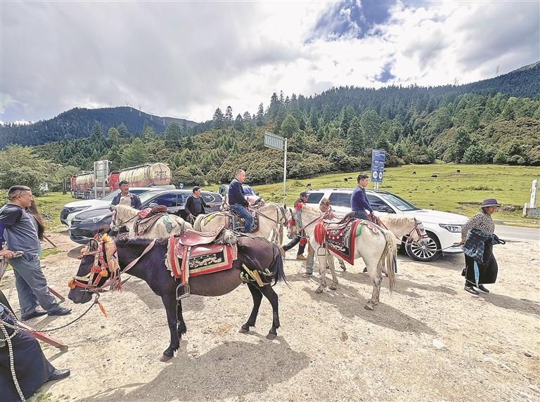 林芝市魯朗景區(qū)內(nèi),游客在體驗當?shù)靥厣T馬項目。記者 白瑪澤旺 攝