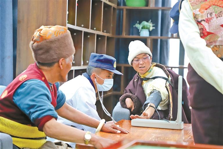 圖為衛(wèi)生員在為縣養(yǎng)老院的老人測(cè)量血壓。