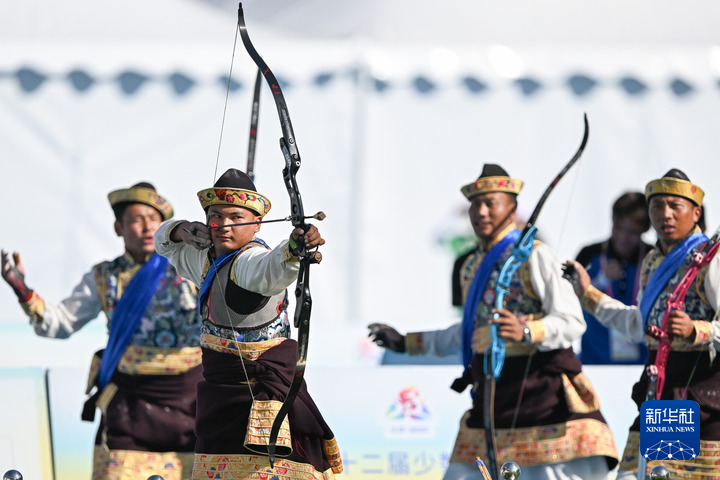 2024年11月27日,第十二屆全國(guó)少數(shù)民族傳統(tǒng)體育運(yùn)動(dòng)會(huì)表演項(xiàng)目中,西藏隊(duì)選手表演《響箭》。新華社記者 孫凡越 攝