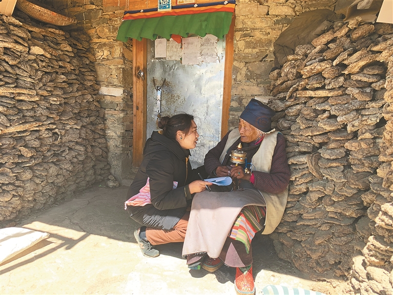 圖為社保工作人員深入貧困戶家中,了解老人養(yǎng)老金發(fā)放情況。