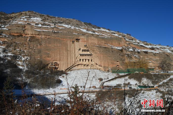 2025年12月22日,崖壁上的千年石窟在白雪映襯下更顯古樸滄桑。(資料圖) 戴文昌 攝