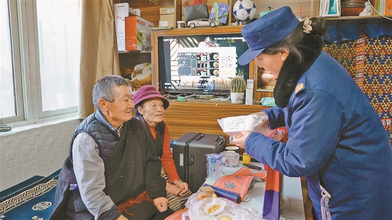消防宣傳員為獨居老人送上消防主題春聯(lián)和宣傳品。陳來曲措 攝