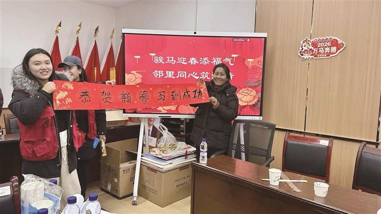 在手工區(qū)內(nèi),居民們揮毫寫春聯(lián)、繪“?!弊?,筆尖流淌祝愿;孩童專注涂畫,小馬圖案躍然紙上,童趣盎然。黨建主題打卡點前,居民手舉“福”字、展露笑顏,拍下馬年第一張團圓合影。一份份滿載心意的宣傳品,也將黨組織的溫暖問候送入千家萬戶。