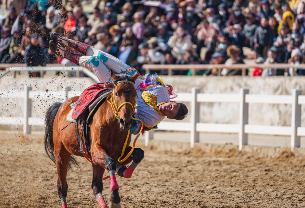 2月20日,馬術(shù)隊員在表演馬背傳統(tǒng)響箭技巧。新華社記者 丁增尼達(dá) 攝