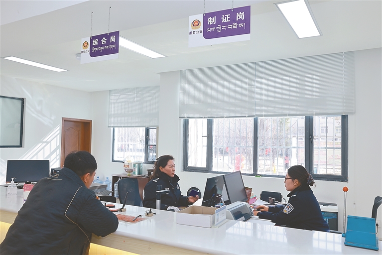 圖為墨竹工卡縣公安局交警大隊服務(wù)大廳內(nèi),民警在為市民辦理業(yè)務(wù)。