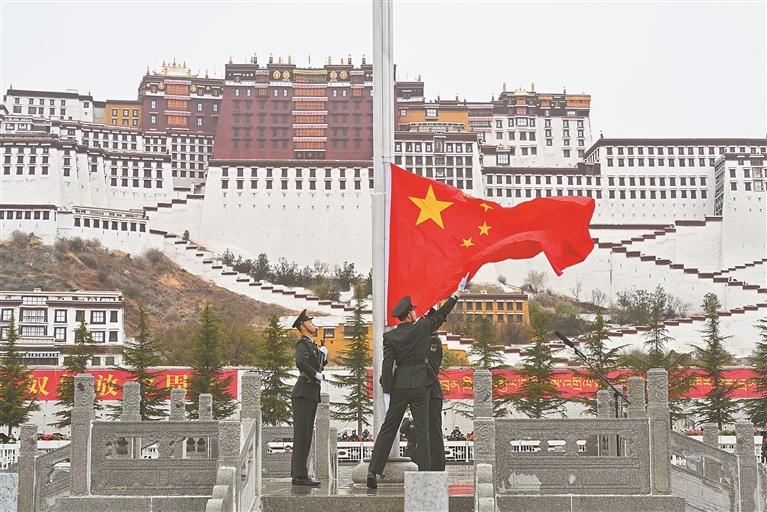 3月28日上午,紀(jì)念西藏百萬農(nóng)奴解放67周年“升國旗 唱國歌”儀式在拉薩布達(dá)拉宮廣場舉行。圖為儀式現(xiàn)場。記者 次仁平措 攝